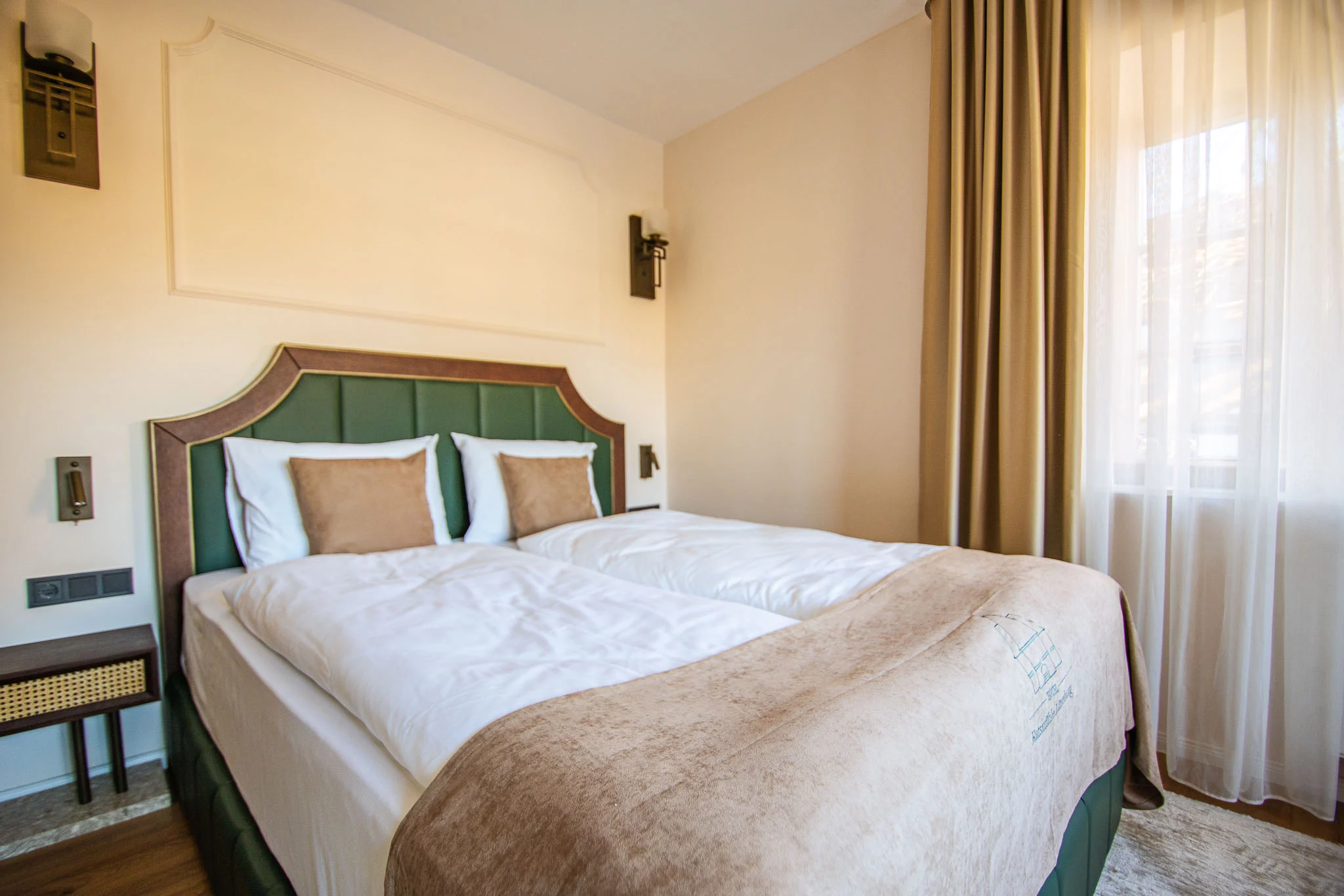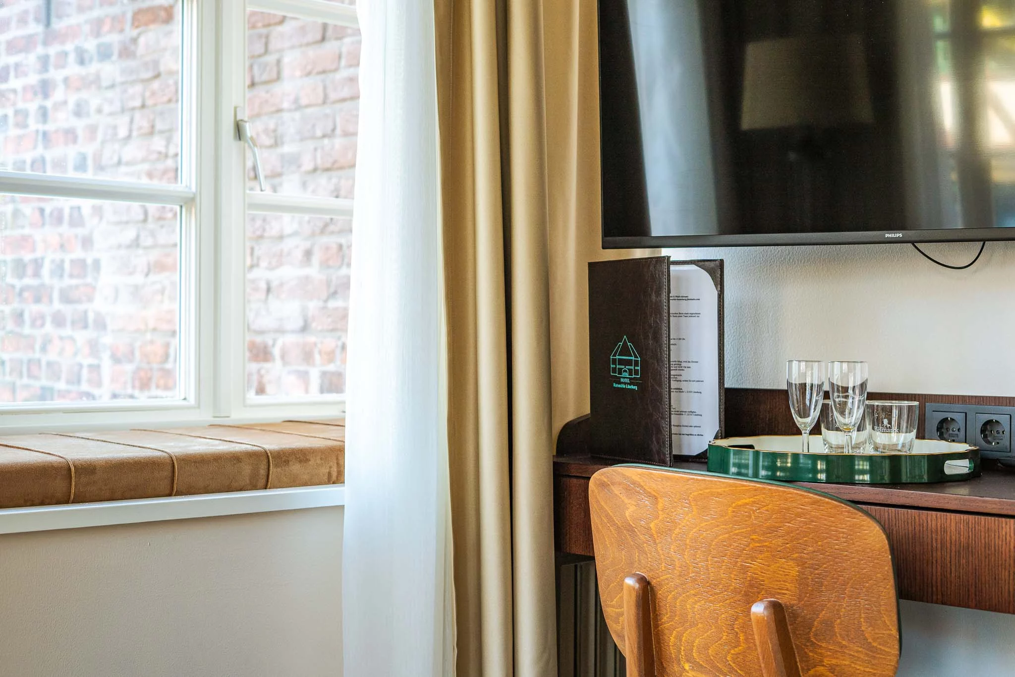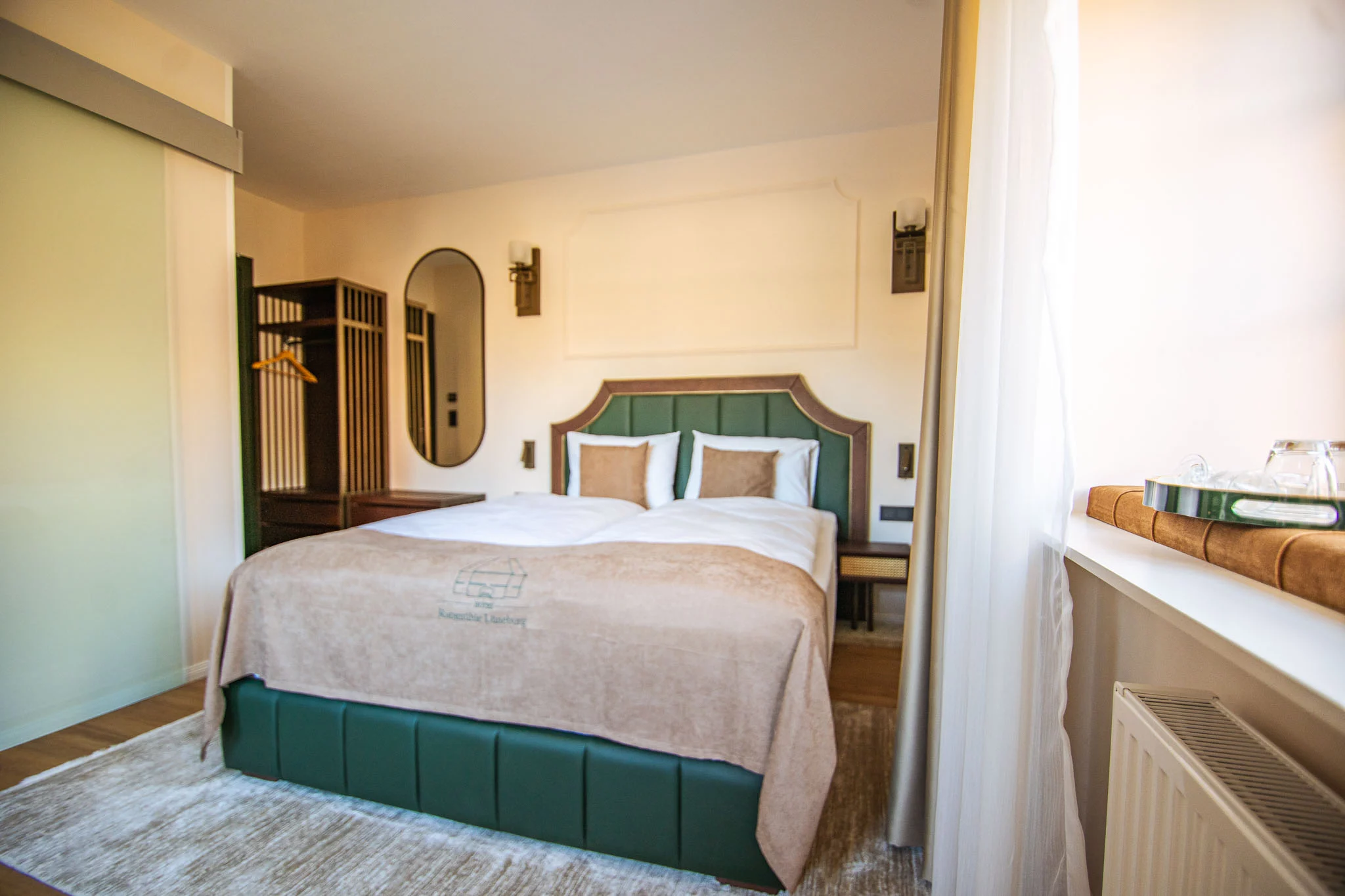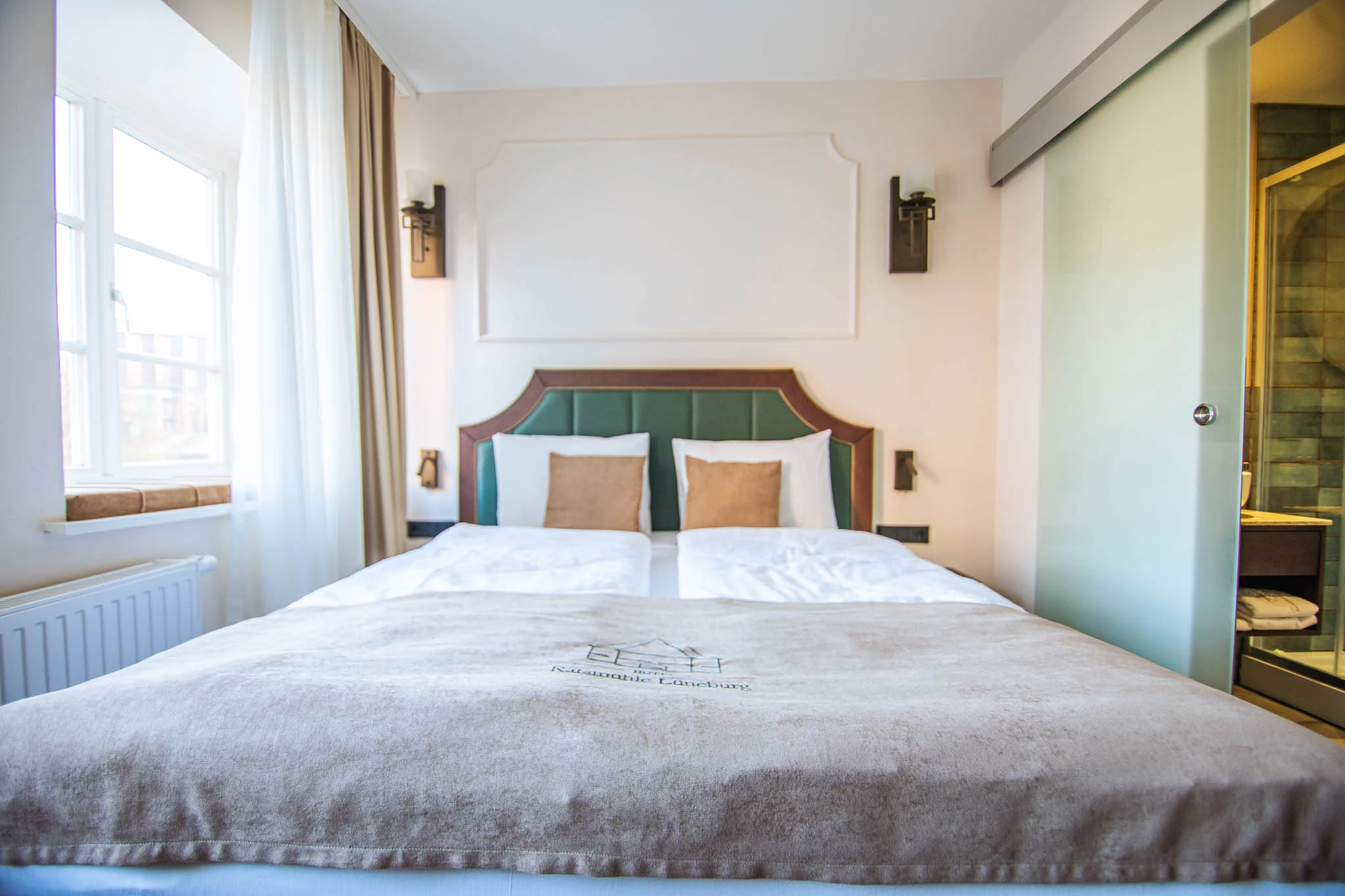 Das Hotelzimmer befindet sich in einem charmanten Altbau in Lüneburg und bietet einen atemberaubenden Seeblick. Die Mischung aus historischen Elementen und modernem Komfort schafft eine warme und einladende Atmosphäre. Das Zimmer ist stilvoll eingerichtet, mit eleganten Möbeln und sanften Farben, die Ruhe und Entspannung fördern. Der Blick auf den See lädt zum Träumen ein und bietet eine malerische Kulisse für einen entspannten Aufenthalt in der historischen Hansestadt Lüneburg.