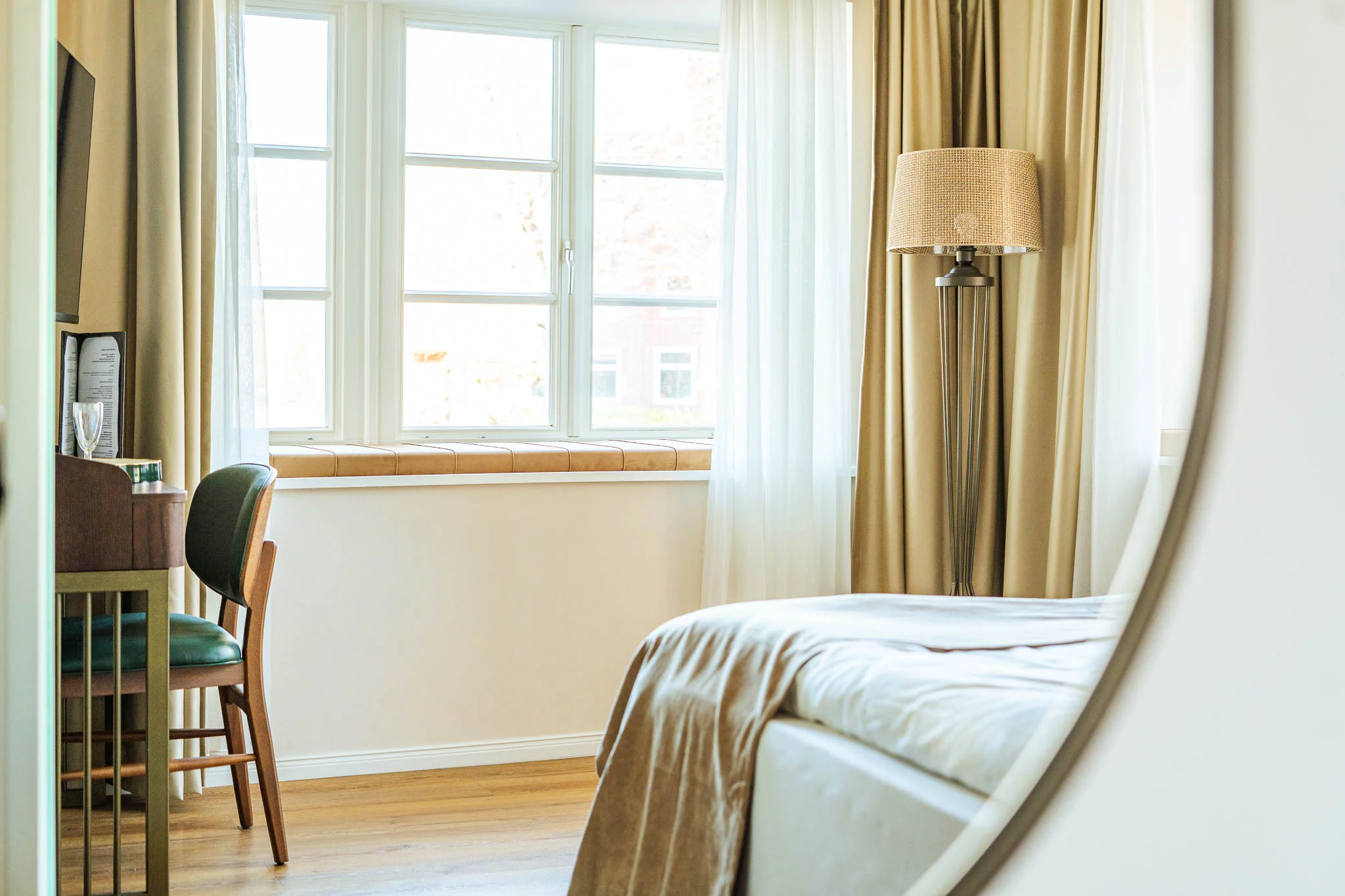 Das Hotelzimmer befindet sich in einem charmanten Altbau in Lüneburg und bietet einen atemberaubenden Seeblick. Die Mischung aus historischen Elementen und modernem Komfort schafft eine warme und einladende Atmosphäre. Das Zimmer ist stilvoll eingerichtet, mit eleganten Möbeln und sanften Farben, die Ruhe und Entspannung fördern. Der Blick auf den See lädt zum Träumen ein und bietet eine malerische Kulisse für einen entspannten Aufenthalt in der historischen Hansestadt Lüneburg.