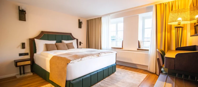 Das Hotelzimmer befindet sich in einem charmanten Altbau in Lüneburg und bietet einen atemberaubenden Seeblick. Die Mischung aus historischen Elementen und modernem Komfort schafft eine warme und einladende Atmosphäre. Das Zimmer ist stilvoll eingerichtet, mit eleganten Möbeln und sanften Farben, die Ruhe und Entspannung fördern. Der Blick auf den See lädt zum Träumen ein und bietet eine malerische Kulisse für einen entspannten Aufenthalt in der historischen Hansestadt Lüneburg.