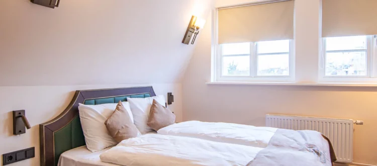 Das Hotelzimmer befindet sich in einem charmanten Altbau in Lüneburg und bietet einen atemberaubenden Seeblick. Die Mischung aus historischen Elementen und modernem Komfort schafft eine warme und einladende Atmosphäre. Das Zimmer ist stilvoll eingerichtet, mit eleganten Möbeln und sanften Farben, die Ruhe und Entspannung fördern. Der Blick auf den See lädt zum Träumen ein und bietet eine malerische Kulisse für einen entspannten Aufenthalt in der historischen Hansestadt Lüneburg.